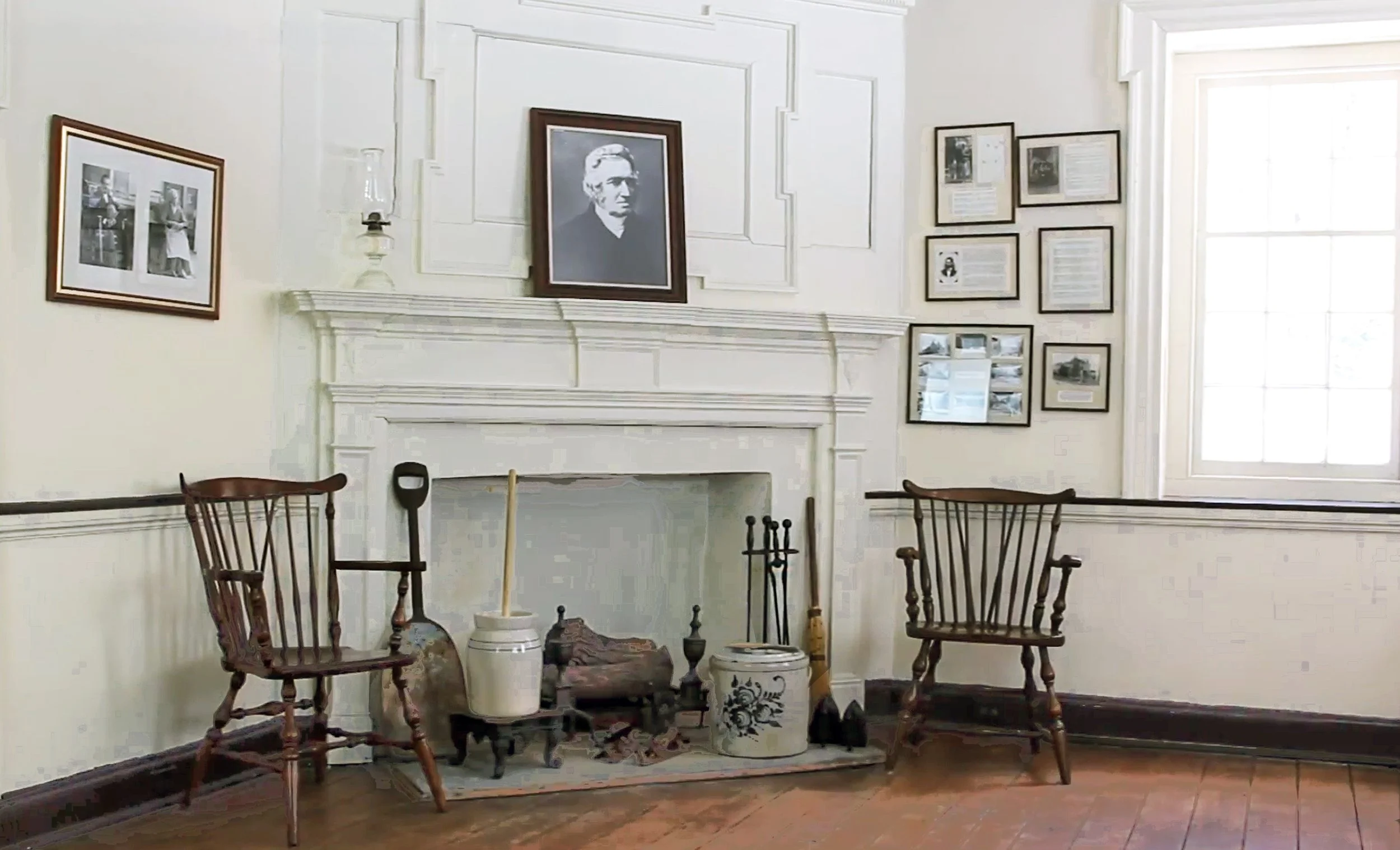 Above: The parlor in the 1794 section of the farmhouse with a portrait of Dr. George Smith. He lived here as a Quaker farmer and state senator, and became a father of public education in Pennsylvania. Image source: Upper Darby Historical Society, YouTube.