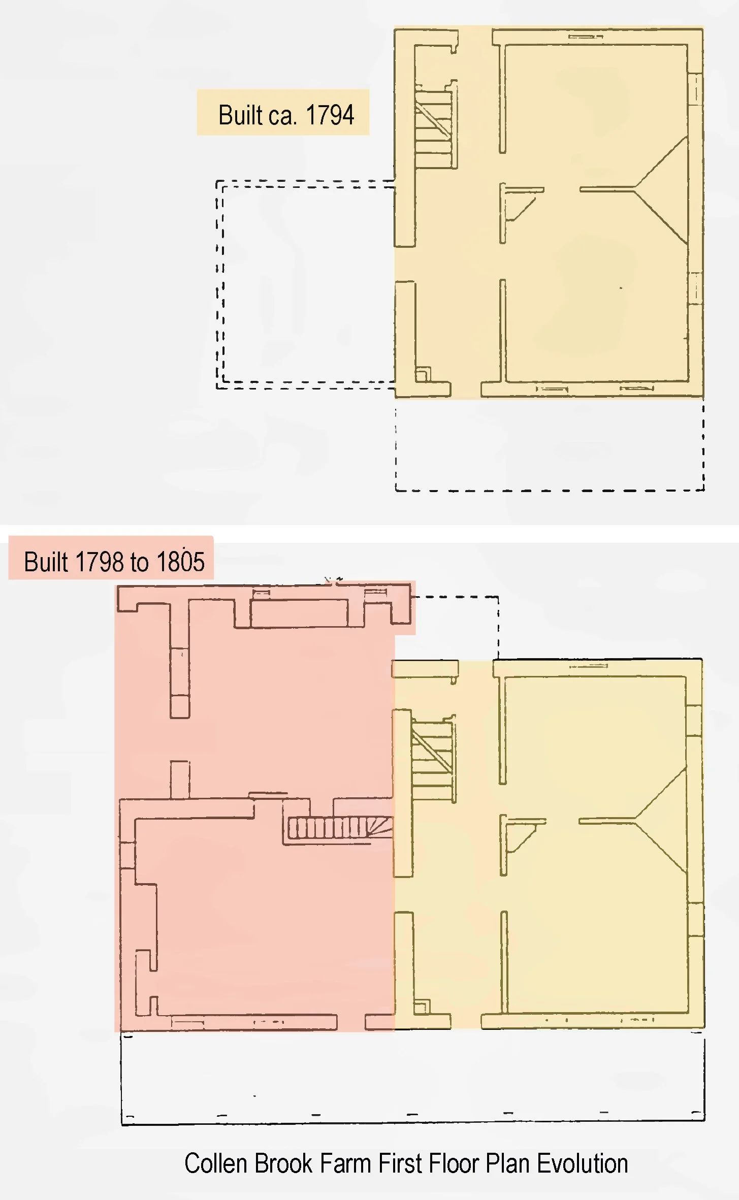 Sara Pennell’s 1992 thesis on Collen Brook farmhouse provides a definitive timeline for the construction of this house. Her research reveals that the right side of the house (the east), was built ca. 1794, and the left side (the west) was built 1798 to 1805. Her thesis updates a construction timeline previously presented in 1988 by Nancy V. Webster and Thomas J. Di Filippo in their nomination for the National Register of Historic Places. Thomas and Di Filippo concluded that the west section predates the east section. But Pennell’s thesis corrects that previous assumption with her analysis of tax lists and other primary-source documents.