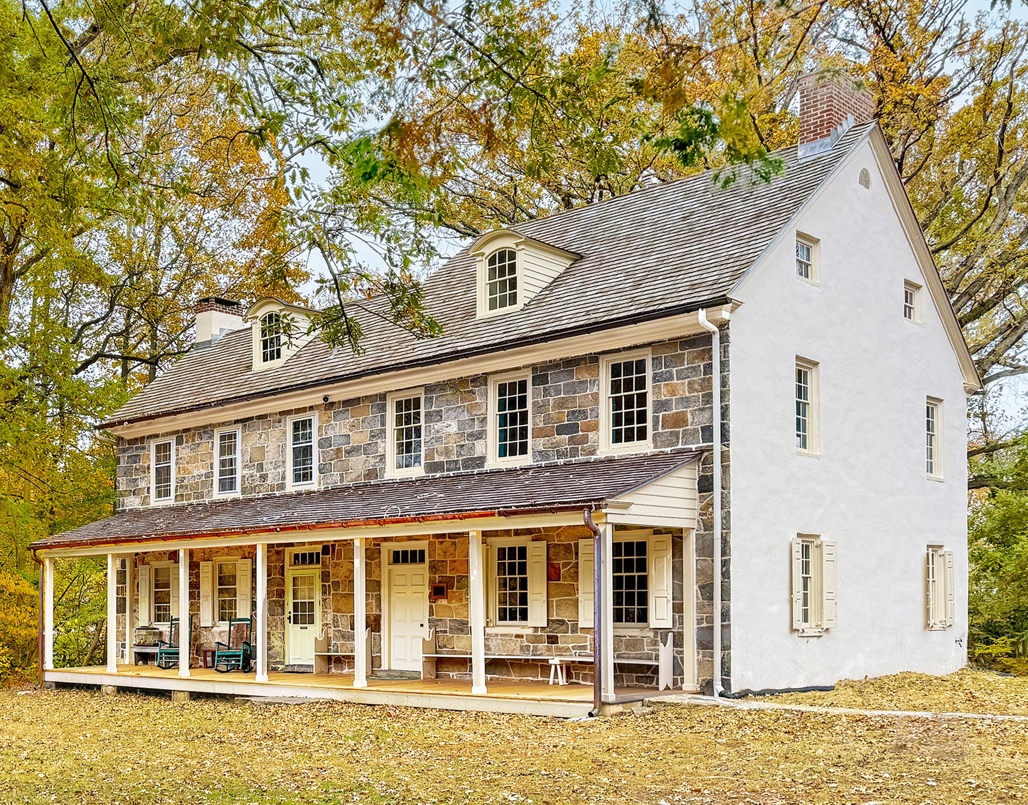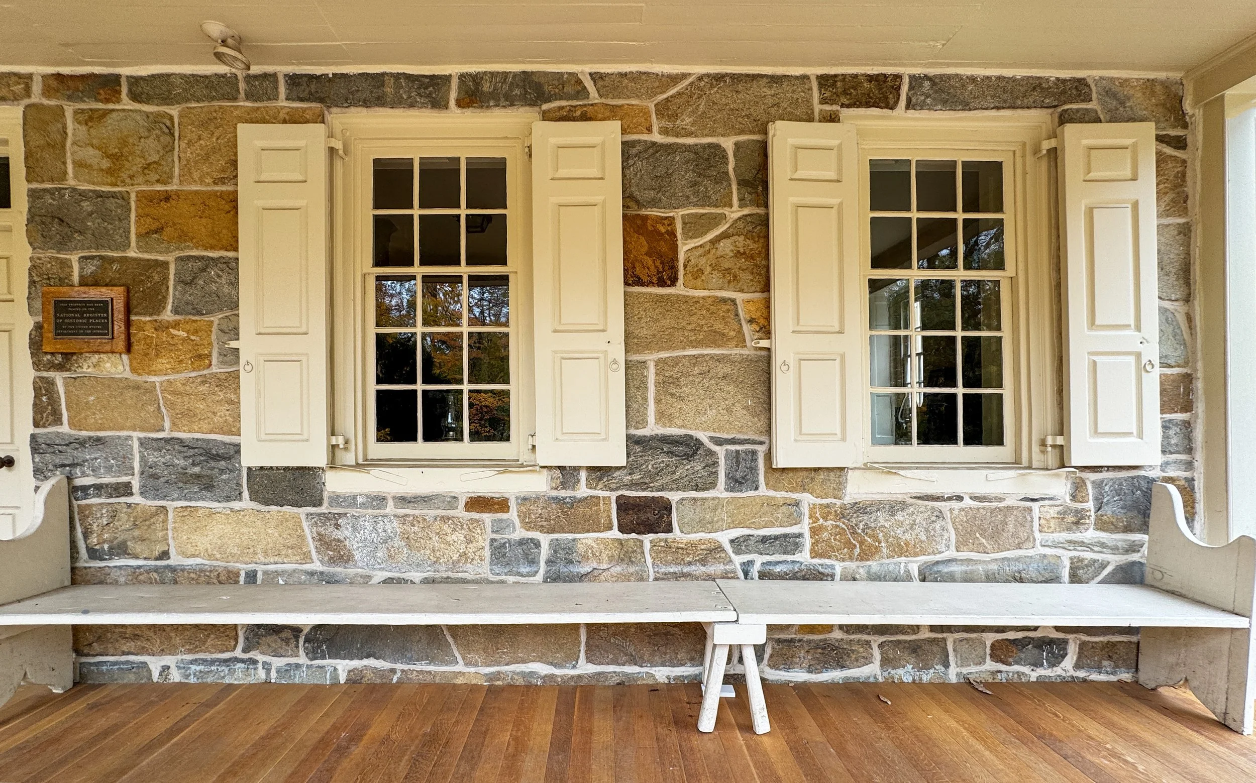 Above: Benches under the front porch. The farmhouse’s stone walls are 18 inches thick. The local bedrock and building stone include gneiss and Wissahickon schist. Image source: Lee J. Stoltzfus
