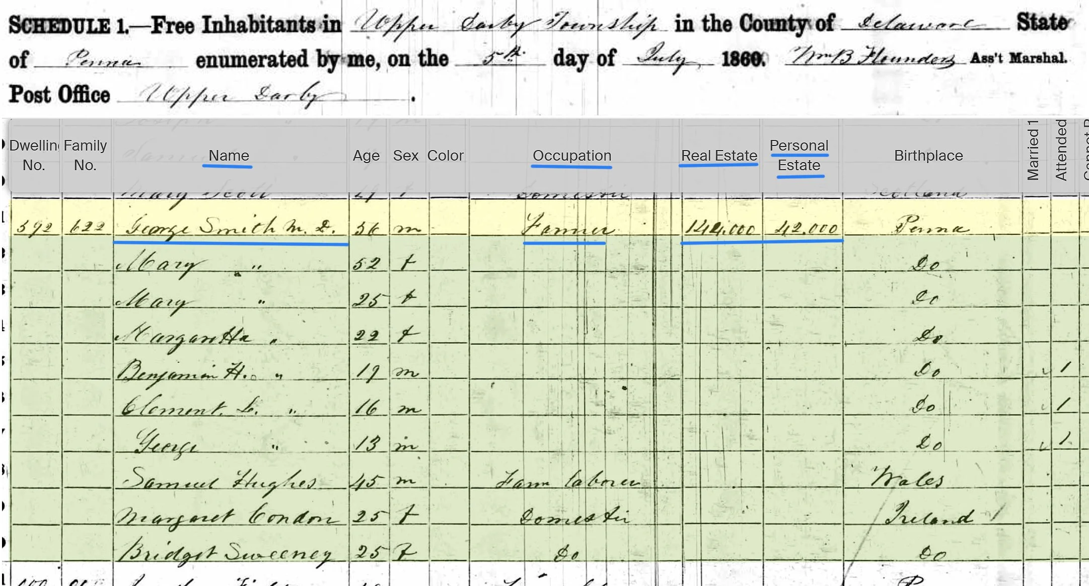 In this 1860 census Dr. Smith is listed simply as a “farmer”, which is a uniquely understated description for a judge and former state senator who owned and managed one of Delaware County’s largest estates.