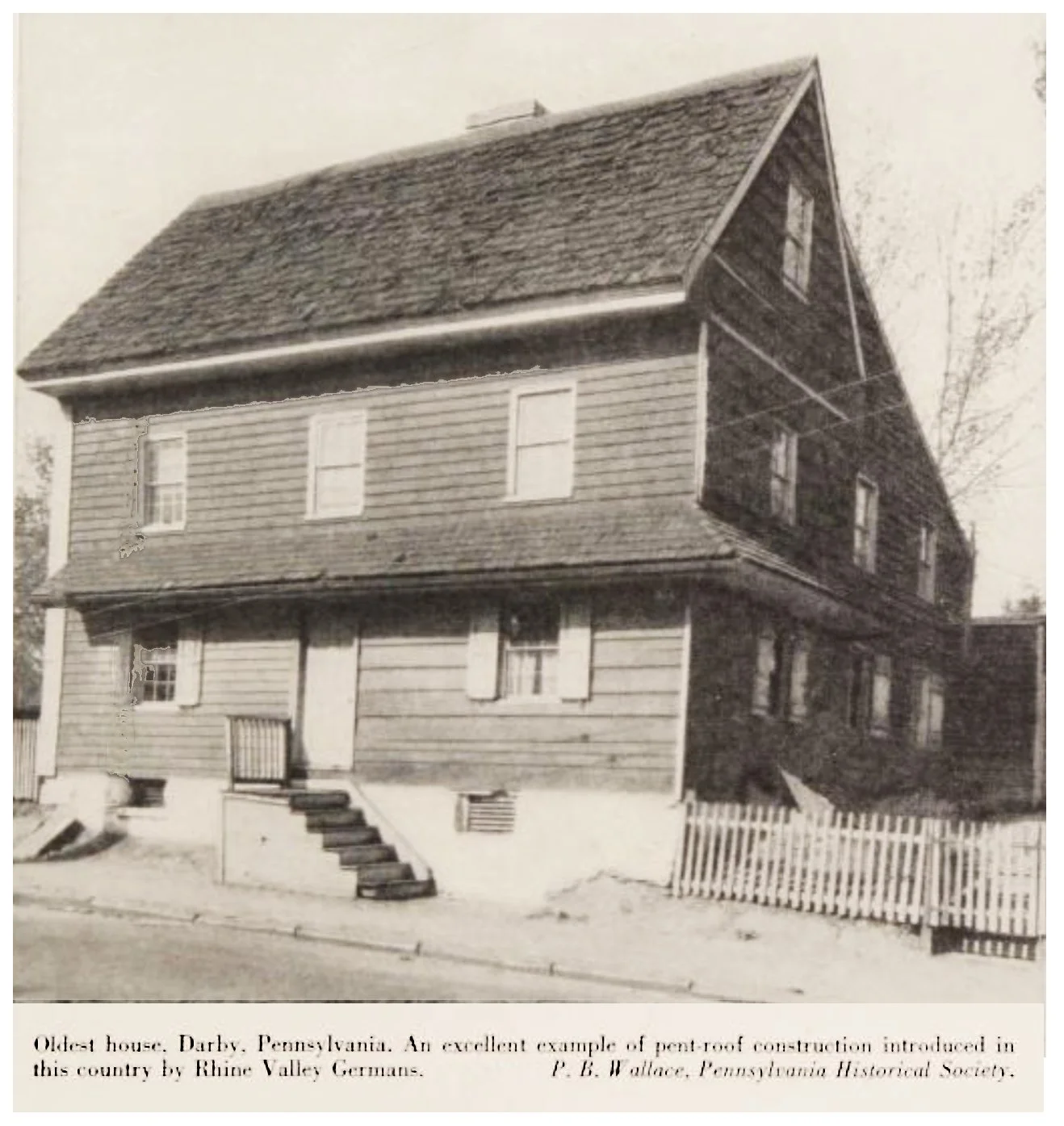 “The most prominent characteristic of the new architecture [Pennsylvania Colonial] is the decorative use of horizontal projections called pent roofs, which were once employed to protect the walls from rain. …in the Rhine Valley, half-timbered construction was commonly employed and in this type of work protection from the rain was of great importance. In England the oversailing of the upper stories was undoubtedly done, to a large entent, for the same reason.”
