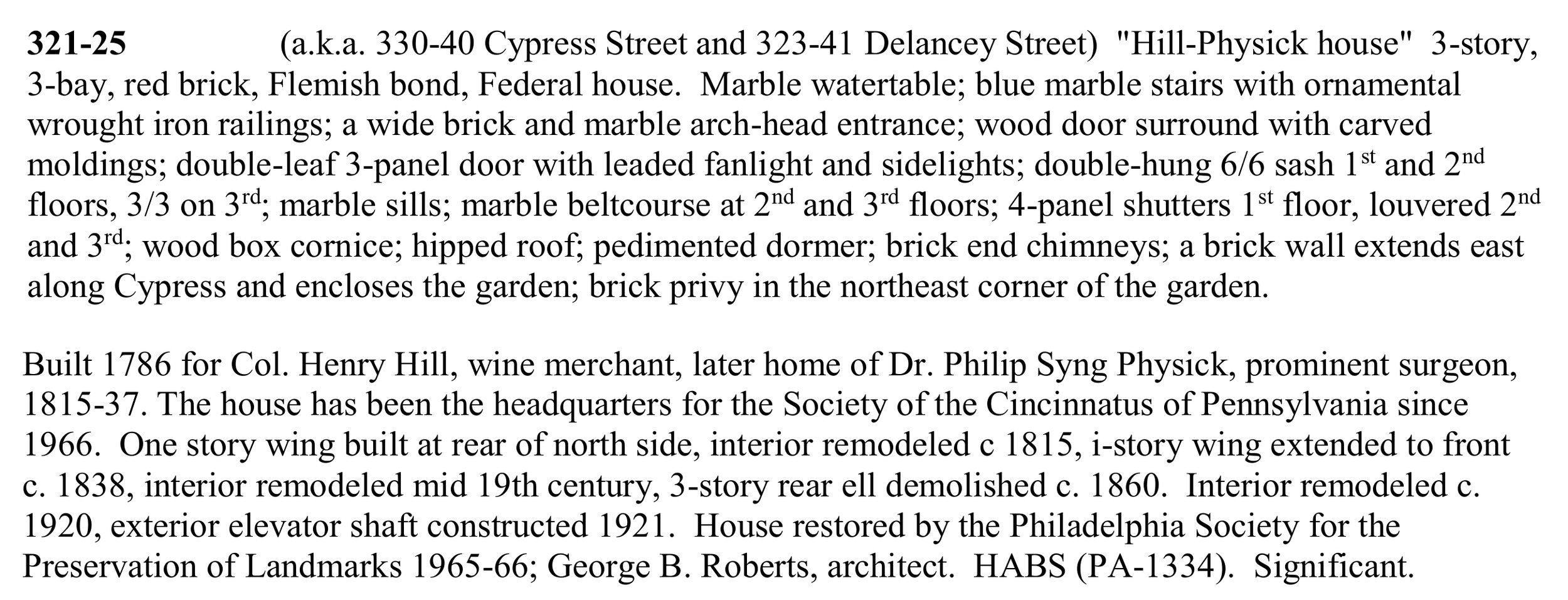 This landmark house is the only free-standing (non-rowhouse) Federal house surviving in Society Hill. It was built in 1786 by wine merchant Henry Hill, who was born into a prominent Quaker family. This house later was home to Dr. Phillip Syng Physick, from 1815 until his death in 1837. Dr. PHysick is known as "the father of American surgery". The house is listed as a National Historic Landmark. It is owned by the Philadelphia Society for the Preservation of Landmarks, and is open to the public as a house museum.