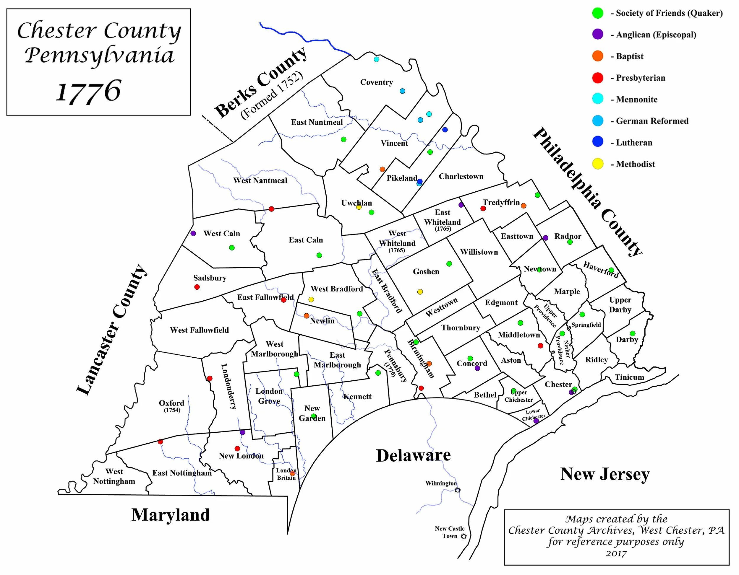 Above: This 1776 map reveals there were more Quaker congregations in Chester County in 1776 than any other religious denomination. Image source: Chesco.org / Chester County Arhives, modified.