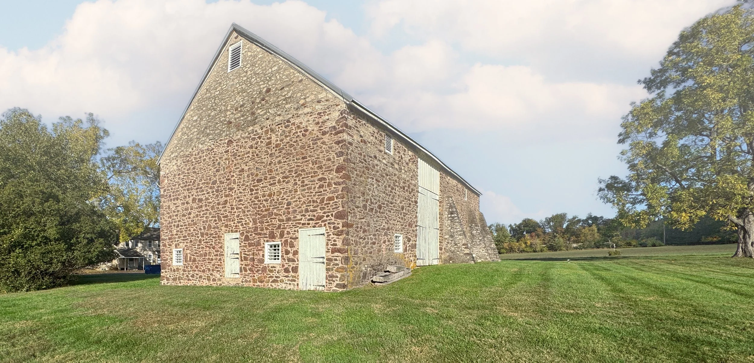 Above: Owners of Hope Lodge modified the barn several times. Jacob Wentz enlarged the barn sometime after 1832. This rear view shows a banked entry that leads to the threshing floor. Stone piers brace the wall. Image source: Lee J. Stoltzfus