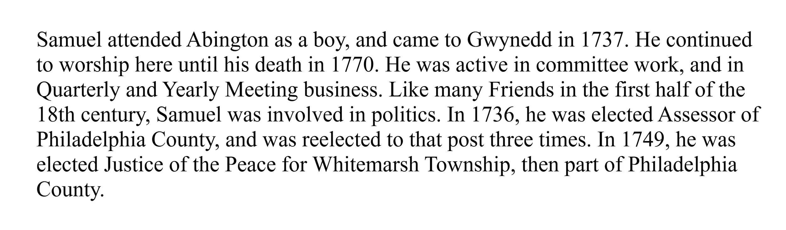 Samuel Morris (1707 - 1770) was a prominent Quaker businessman and civic leader. His father, Morris Morris, emigrated from Caernarvonshire, Wales, and became a Quaker elder. His mother was Susanna (Heath) Morris, a well-known traveling Quaker minister born in Staffordshire, England. Samuel Morris served on numerous Quaker committees and was elected Assessor of Philadelphia County several times. He later became Justice of the Peace for Whitemarsh Township.