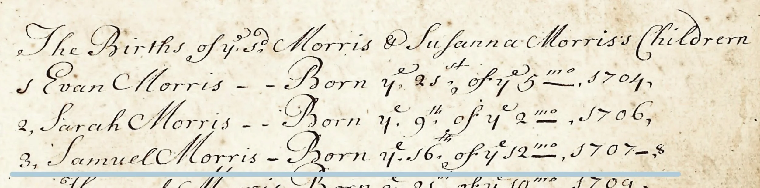 Samuel Morris’ grandparents, Evan Morris and Gainor Morris, emigrated to Pennsylvania from Merioneth, Wales. Samuel Morris’ father, Morris Morris, donated the land for the Richland Quaker Meetinghouse. Samuel Morris’ mother, Susanna Heath, was a prominent Quaker minister.