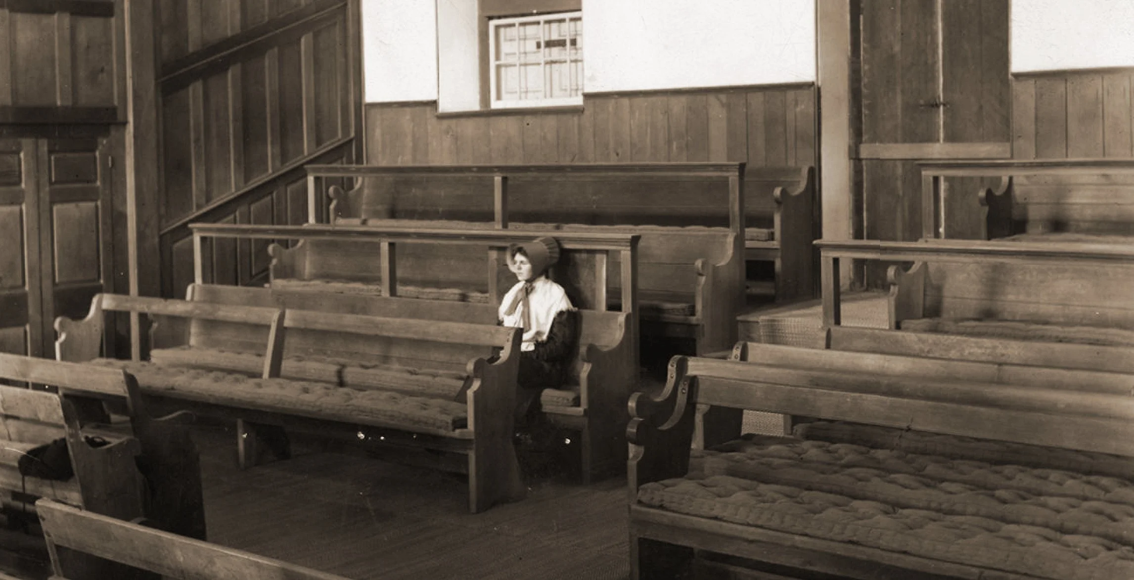 Above: A Quaker woman poses inside Gwynedd Meeting House. An inscription on the photo suggests the woman might be Sarah S. Jenkins in 1913. Image source: TriCollegeLibraries.