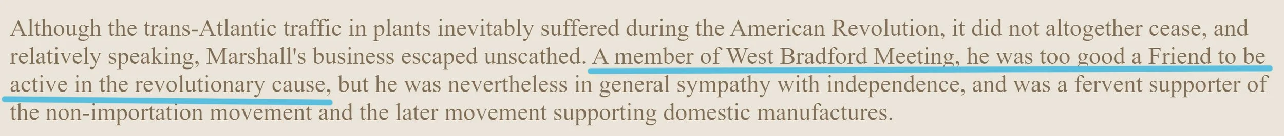 In the early 1700s Abraham Marshall (Humphry Marshall’s father) settled in Chester County, near today’s Marshallton. From 1722 to 1727 the Bradford Friends met in the Marshall home. Abraham Marshall was the founder of this meeting that later moved to Marshallton.