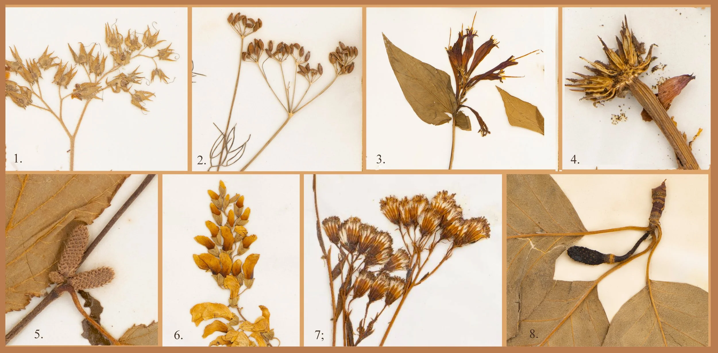 #5. Corylus cornuta Marshall (Beaked Hazelnut) Collected in 1835. #6. Cytisus laburnum L. (Golden Chain Tree) Collected in 1819. #7. Cacalia suaveolens L. (False Indian Plantain) Collected in 1819. #8. Magnolia acuminata (L.) L. (Cucumber Tree) Collected in 1829. Image sources: Mid-Atlantic Herbaria Consortium