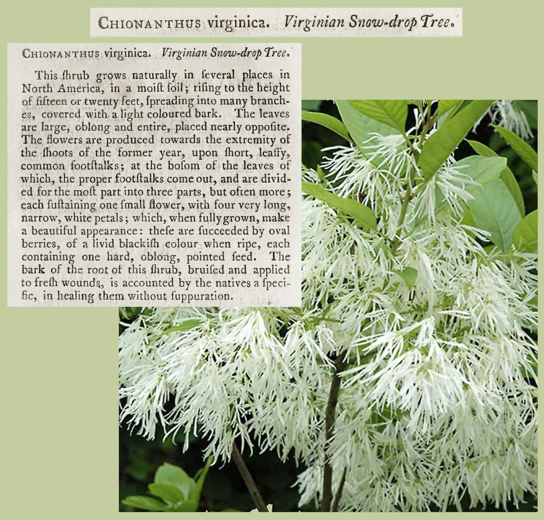 Above: Chionanthus virginicus / Fringe Tree (Snow-Drop Tree) Image source: Text: Internet Archive. Fringe tree: TidewaterTrees.com