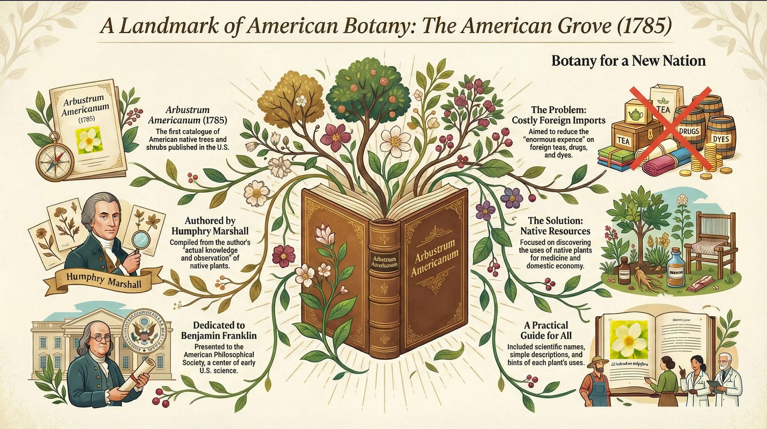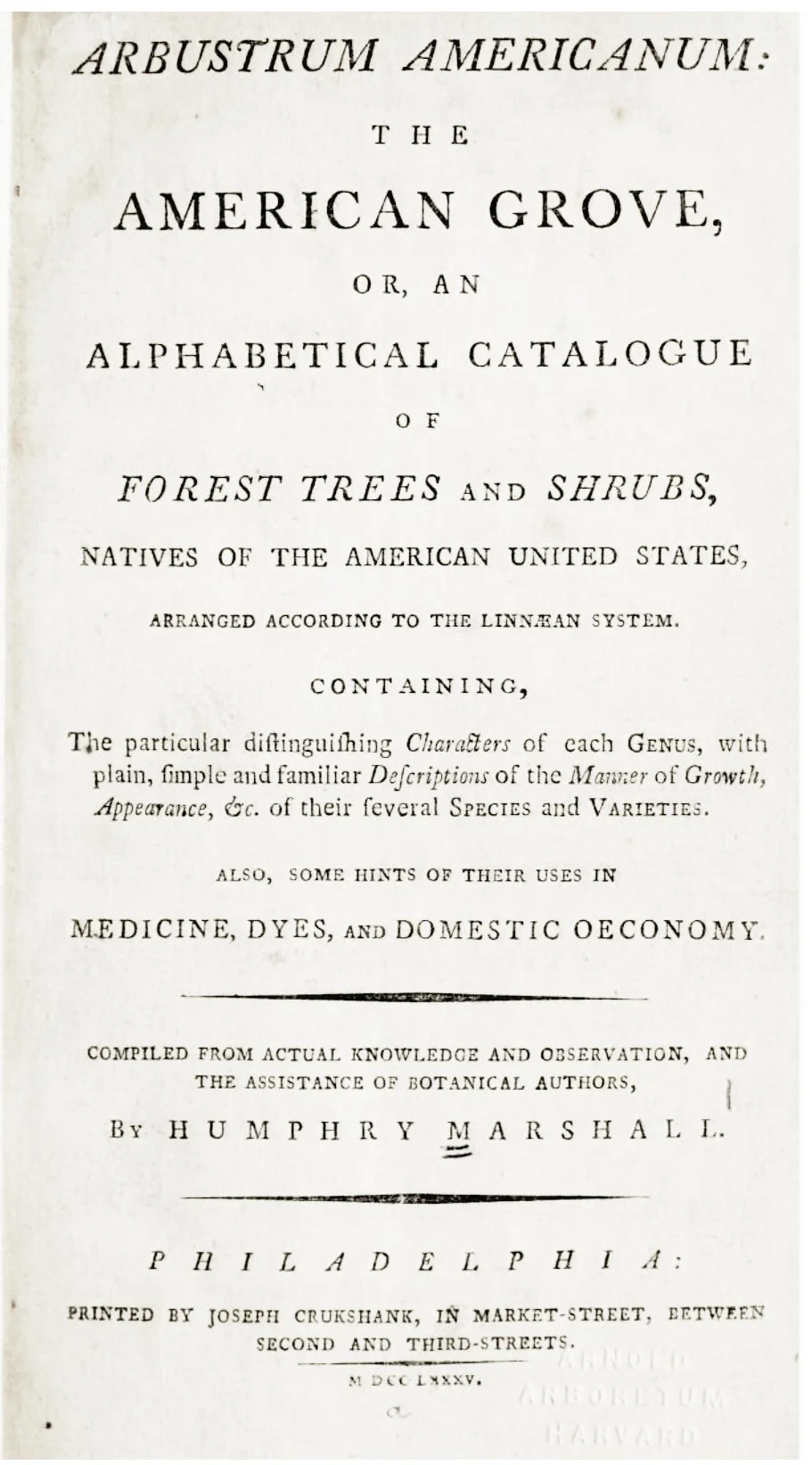 Humphry Marshall’s Arbustrum Americanum (1785) is the first botanical book written and published in America. The text describes more than 200 native trees and shrubs of the U. S.