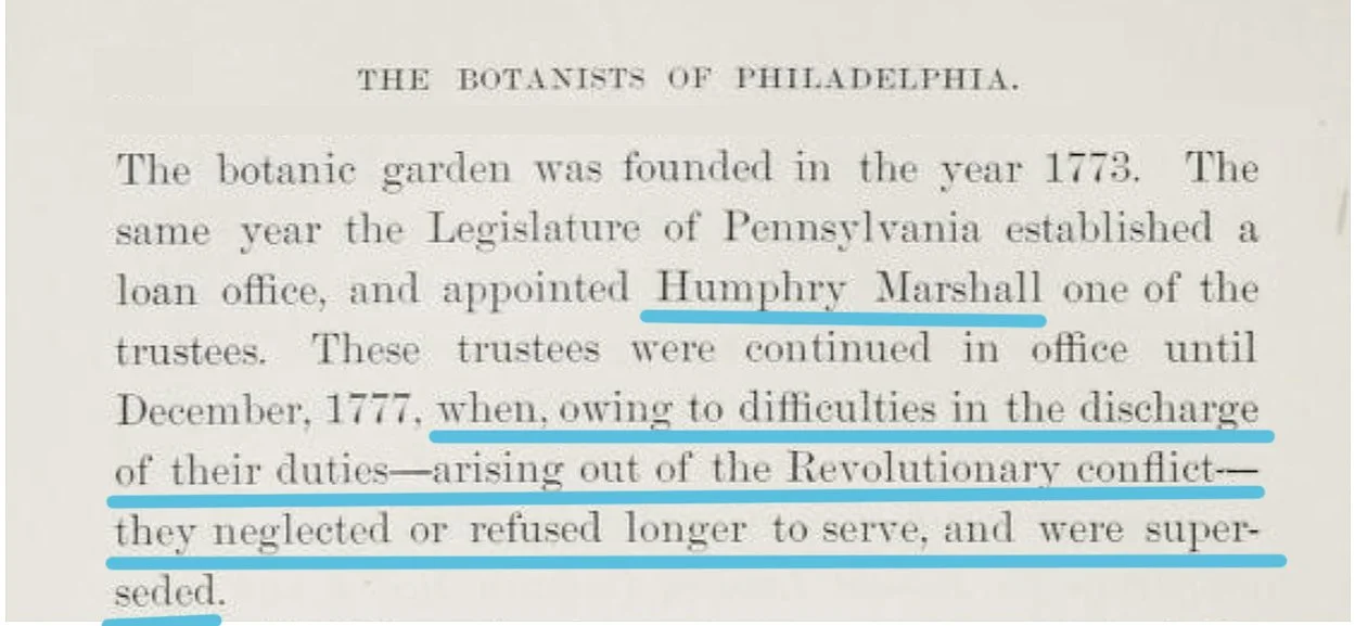Quaker trustees such as Humphry Marshall, Moses Brinton, and Samuel Preston Moore resigned in 1777 because the new Revolutionary laws and the wartime political climate conflicted with their religious principles. They objected to serving a government engaged in war, and refused new loyalty requirements. As a result they discontinued their service, and the Assembly replaced them.