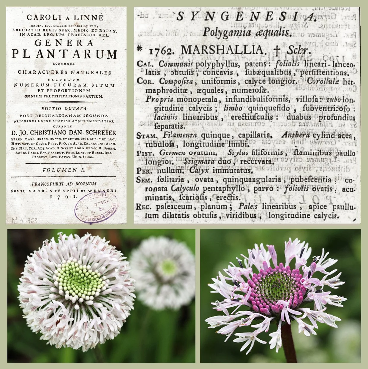 In 1791, German botanist J. C. D. von Schreber named a genus of American plants Marshallia to honor Humphry Marshall and his botanist nephew Moses Marshall. The Marshallia name was first published in Schreber’s Genera Plantarum, 1791. Rev. Henry Muhlenbert, a botanist from Lancaster, PA, had encouraged Schreber to honor the Marshalls with that name. Links: Marshallia in World Flora Online, Marshallia in Plants of the World Online