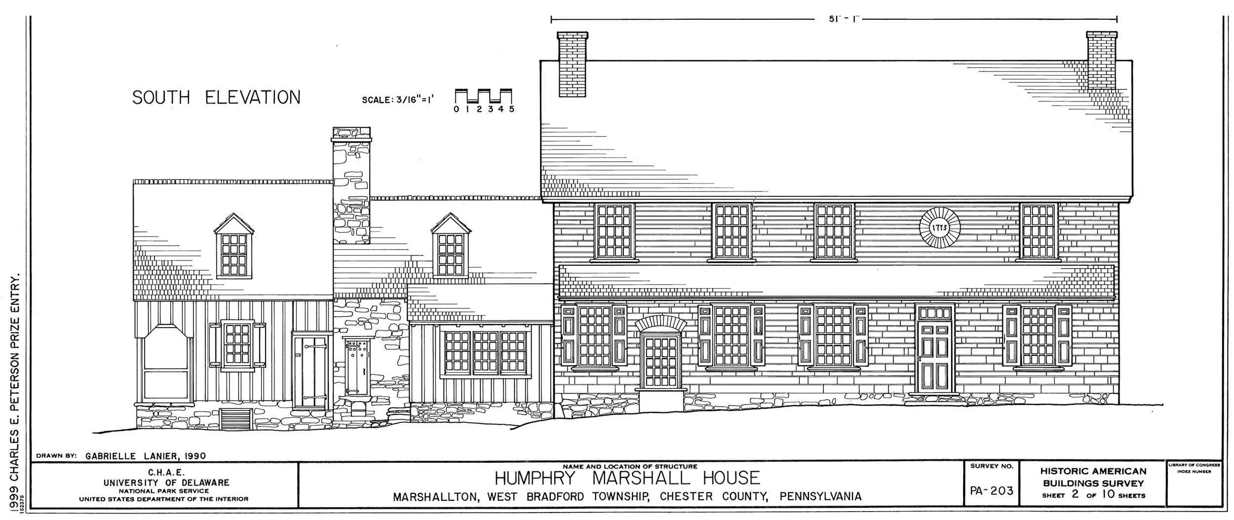 Humphry Marshall also used galletted masonry on the nearby farmhouse, illustrated on this page. He built his house in 1773, a few years after he helped build this meetinghouse. This distinctive masonry technique also appears in the 1760 greenhouse of his botanist cousin John Bartram.
