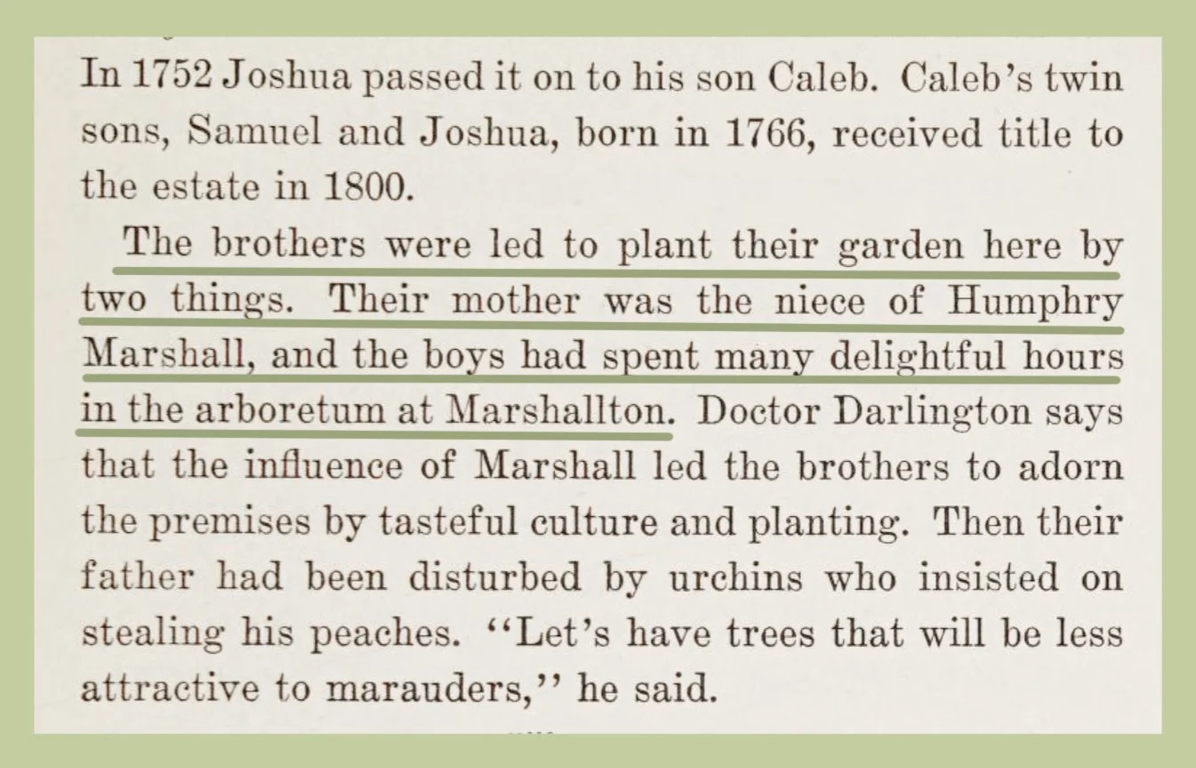 Twin brothers, Samuel and Joshua Peirce, were Quaker farmers who created Peirce’s Park, which evolved to become Longwood Gardens. These twin brothers received title to the Peirce estate in 1800. Their mother was a niece of botanist Humphrey Marshall. The Peirce boys spent many hours here in the Marshall arboretum.