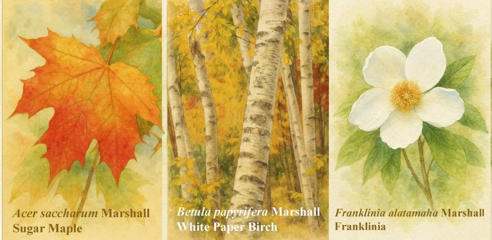The plant list, above, includes species bearing the author name “Marshall” signifying that they were first validly published by Humphry Marshall in his 1785 work Arbustrum Americanum. While Marshall described and named many additional plants in that volume, taxonomic revisions over time have reclassified some of his names as synonyms under later or more widely accepted designations.