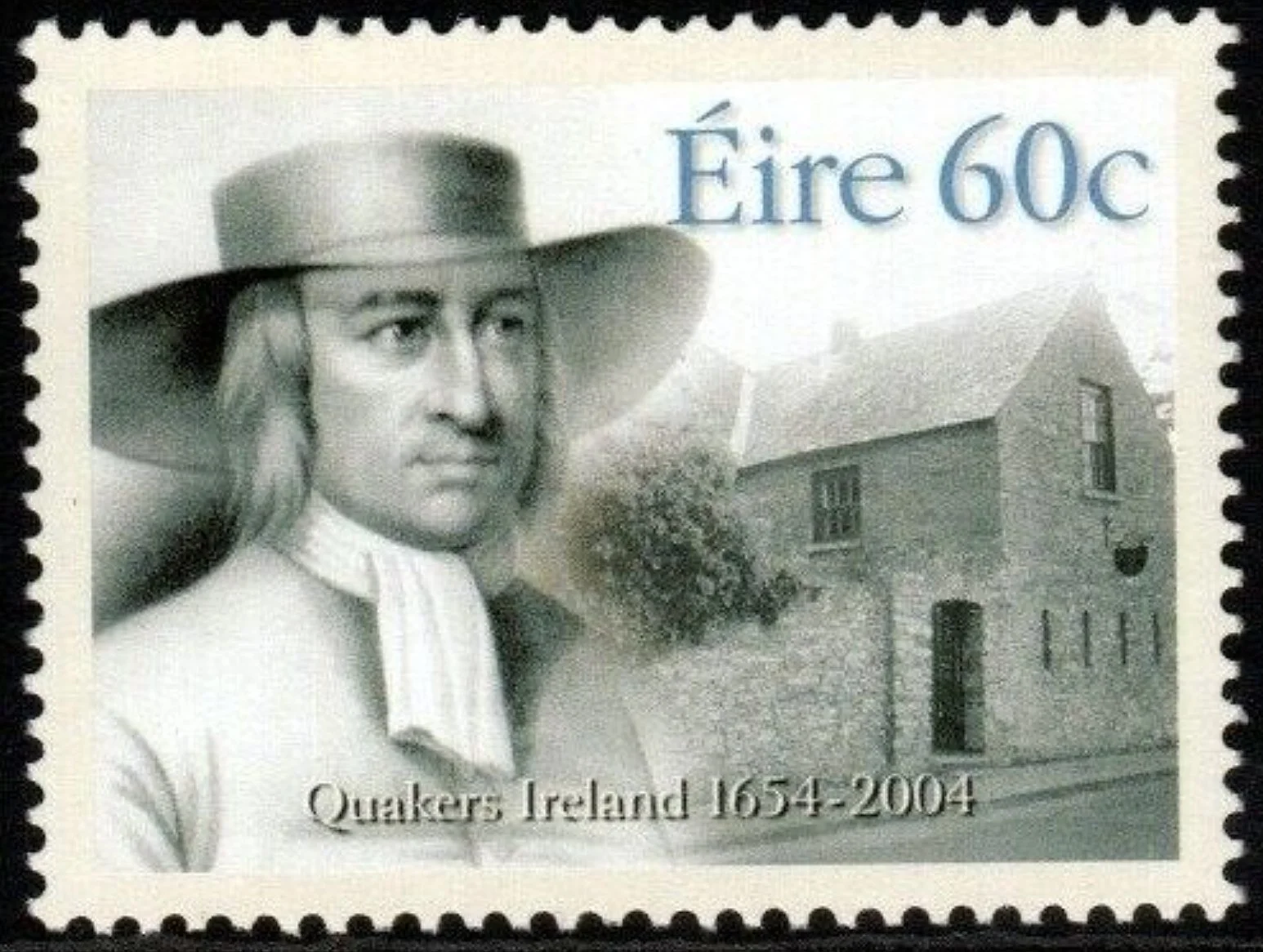 Above: A 2004 Irish postage stamp depicting Quaker leader George Fox with an image of the Quaker Meeting House in Ballintore, Co Kildare in the background.Image source: HipStamp.com
