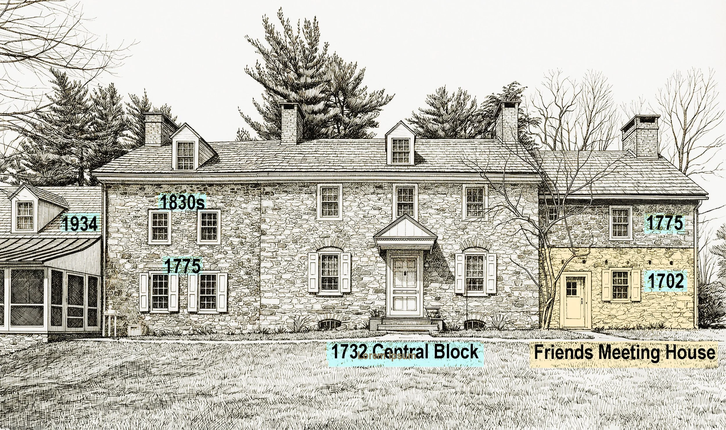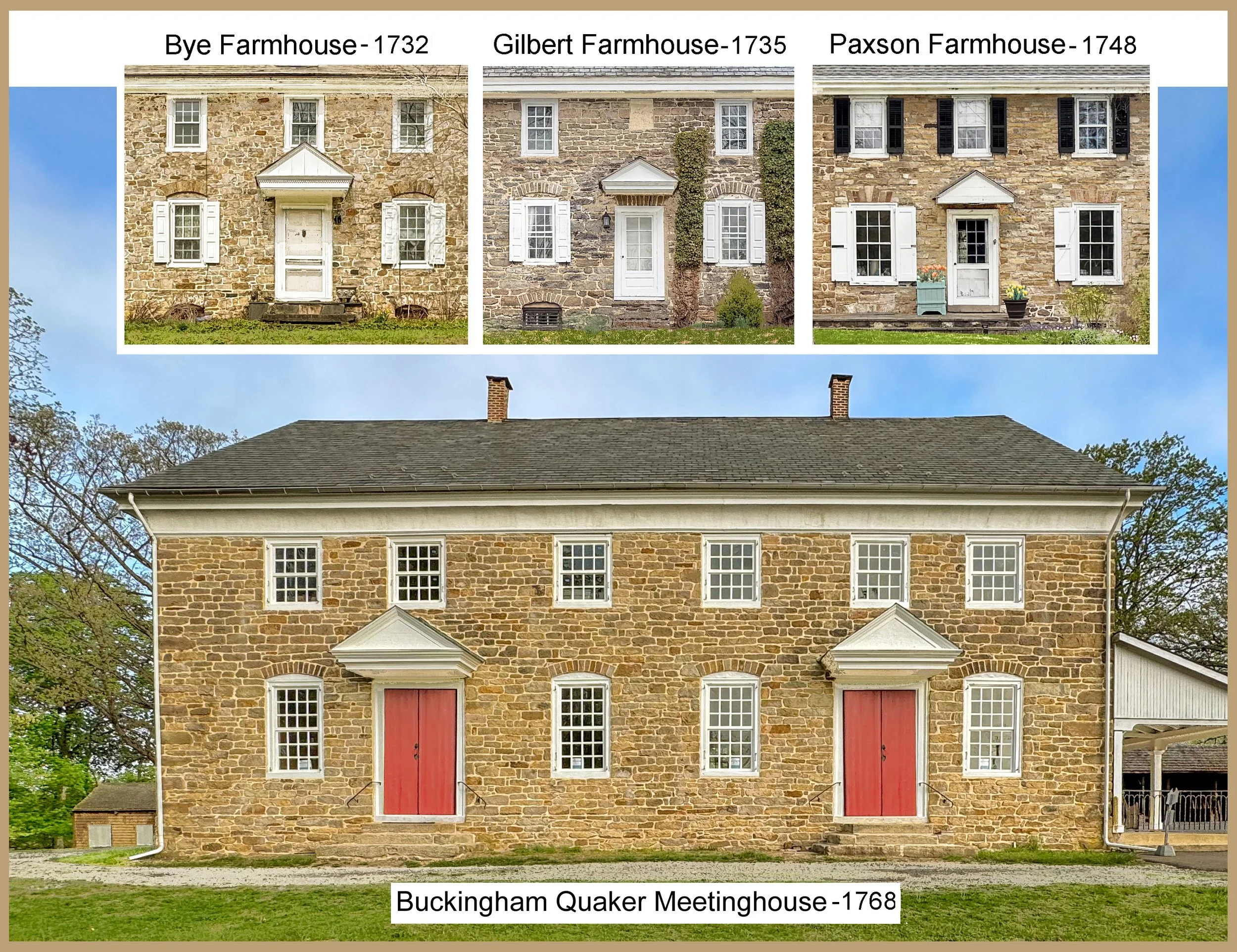 Above: Bye farmhouse: 1732 (central section with hood), Gilbert Farmhouse: 1735 (first section with hood), Paxson Farmhouse: 1748 (dirst section with hood)