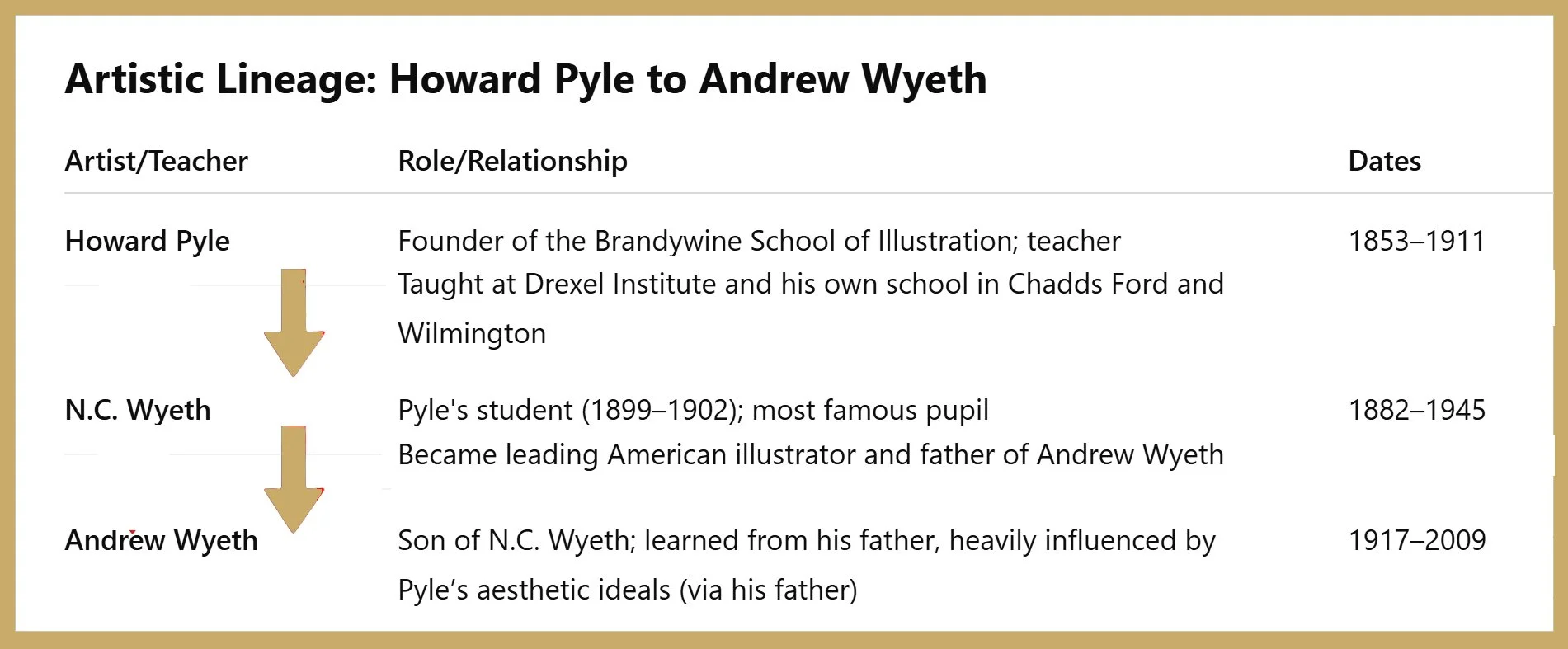 Howard Pyle founded a summer art school at Chadds Ford. He brought a select group of his most promising students from Wilmington to the Brandywine Valley, where they lived and worked together in a setting rich with American history. The program emphasized storytelling, dramatic composition, and historical authenticity, values that became central to what would later be called the Brandywine School. Among Pyle’s most notable students were N.C. Wyeth, Jessie Willcox Smith, Maxfield Parrish, and Frank Schoonover, all of whom went on to become leading American illustrators in the early 20th century.