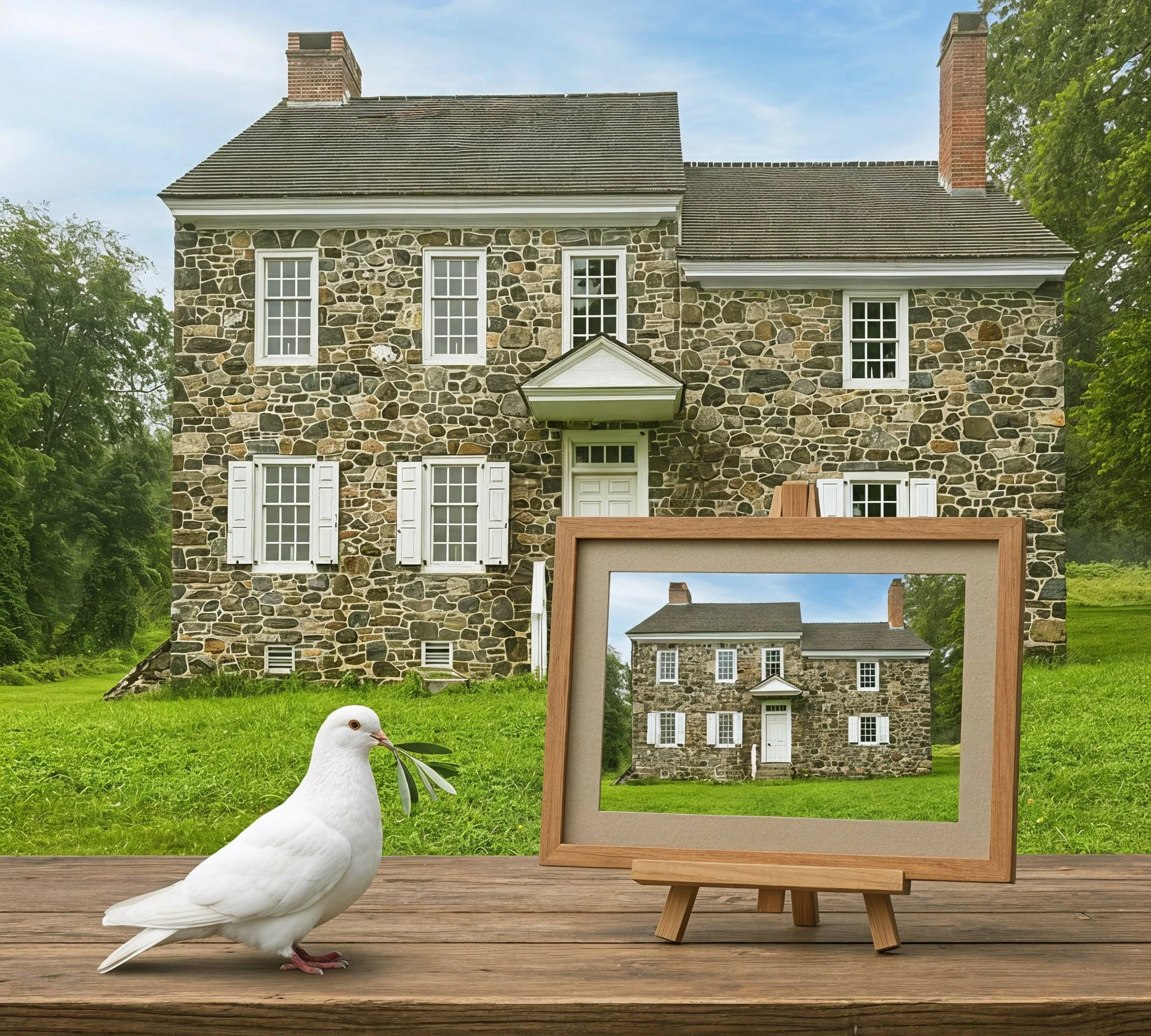 Above: A digital Quaker dove of peace at the Ring House / George Washington’s headquarters on the Brandywine Battlefield. Image source: Lee J. Stoltzfus / Leonardo.AI