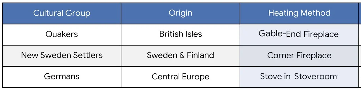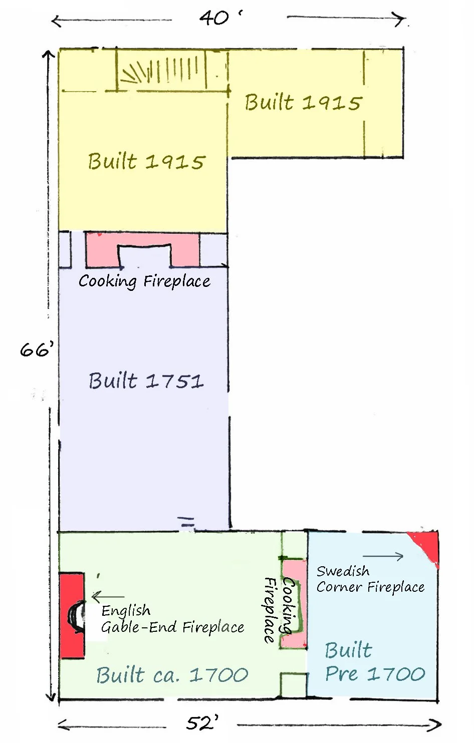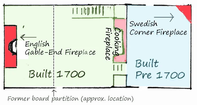 The house’s earliest section, built before 1700, has a corner fireplace typical of Swedish and Finnish settlers. In contrast, the house’s addition built ca. 1700 has a gable-end fireplace typical of settlers from the British Isles.
