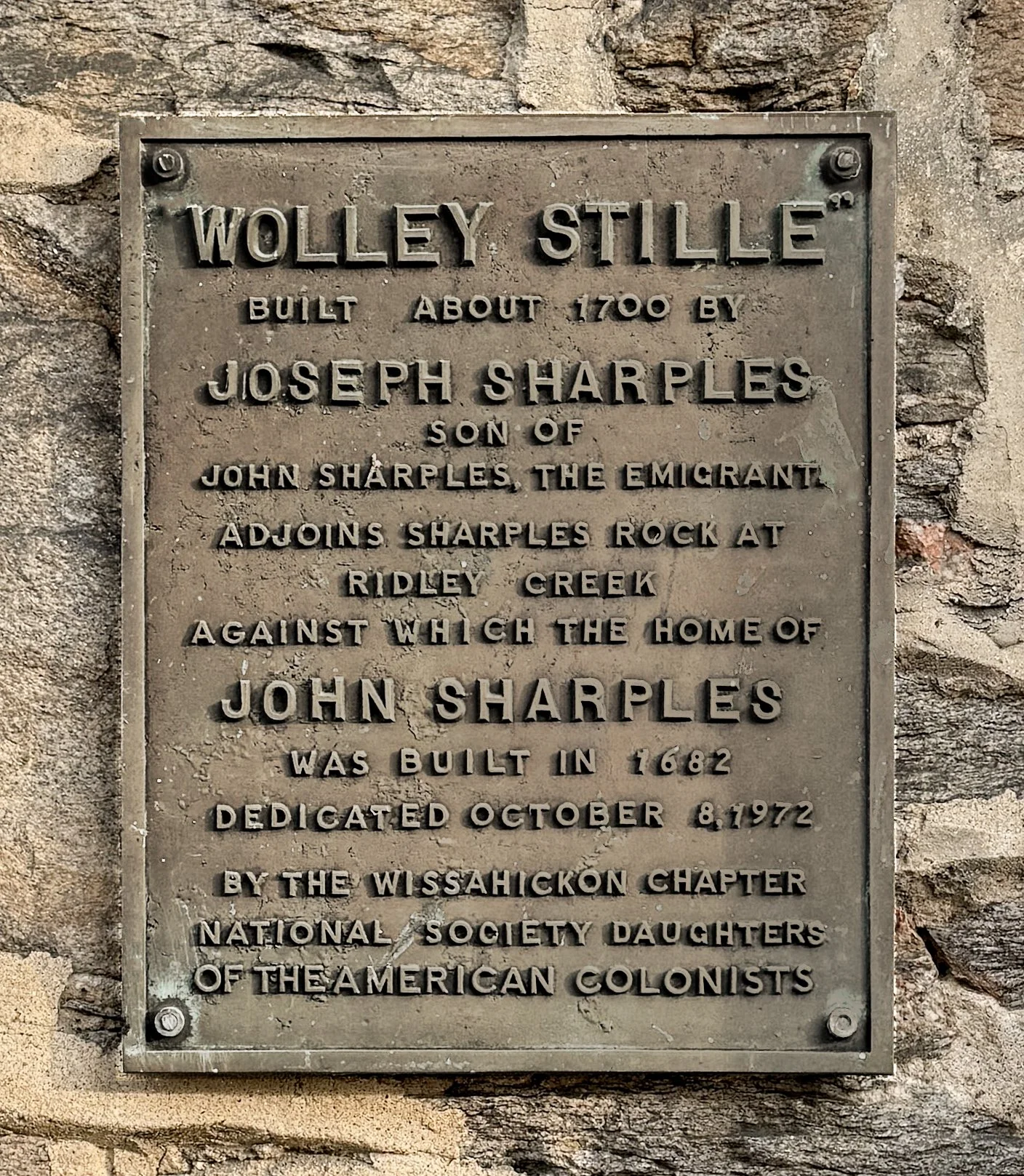 Joseph Sharples, Sr. (English Quaker immigrant) married Lydia Lewis (Welsh Quaker immigrant) in 1704 at Haverford Meeting. They built this home on Oele Stille’s Creek, [Oele Stillin's Kill] named for Olof [Oele] Stille, a prominent Swedish immigrant who had settled near here as early as 1641. Olof Stille was a millwright and judge at Fort Christiana. His English neighbors called him Wolley Stille.