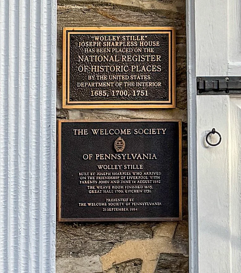 Above: Historical markers by the front door for the National Register of Historic Places and for the Welcome Society of Pennsylvania.