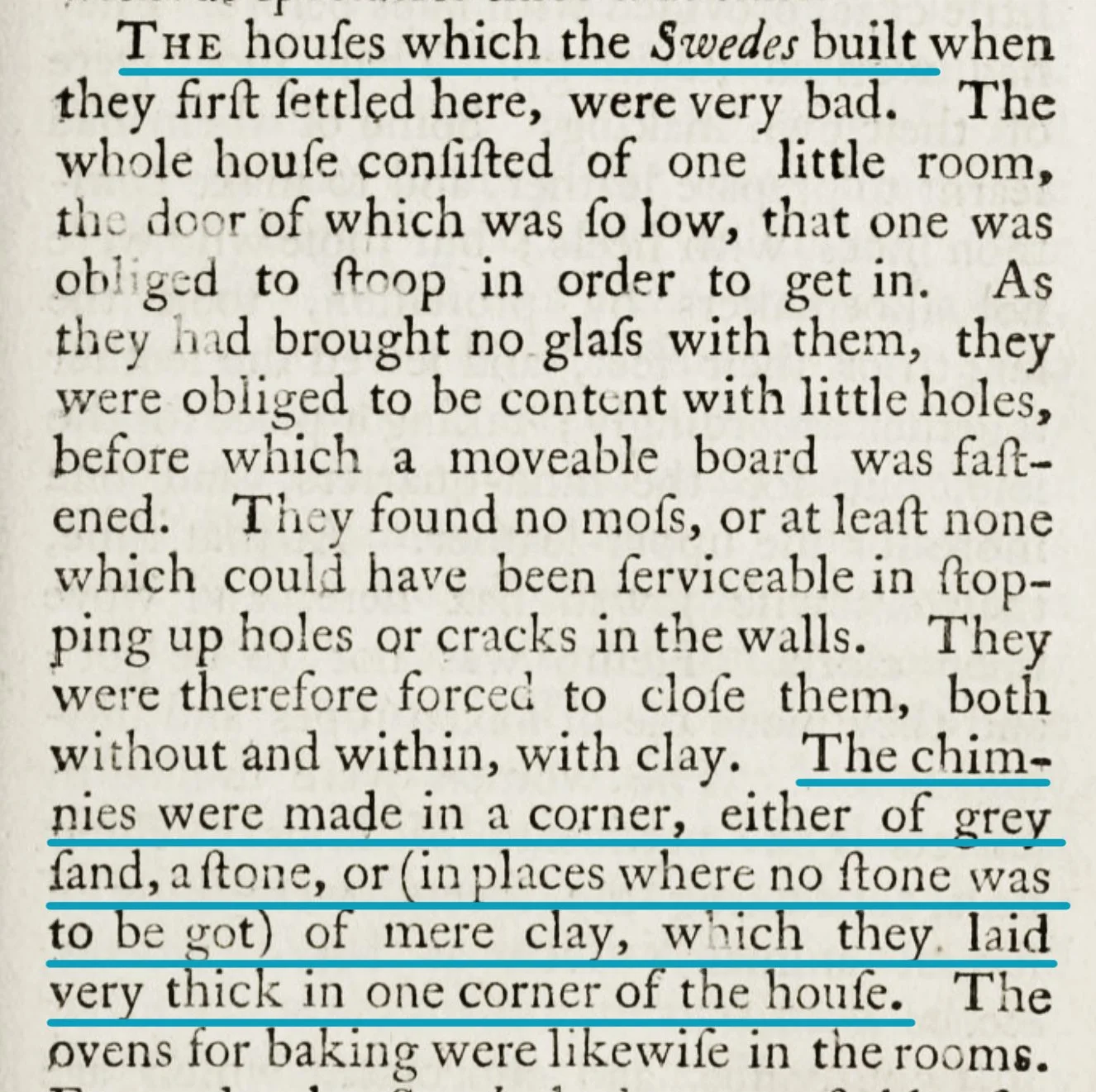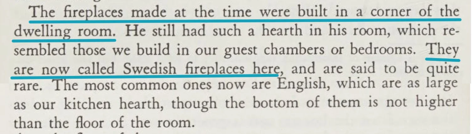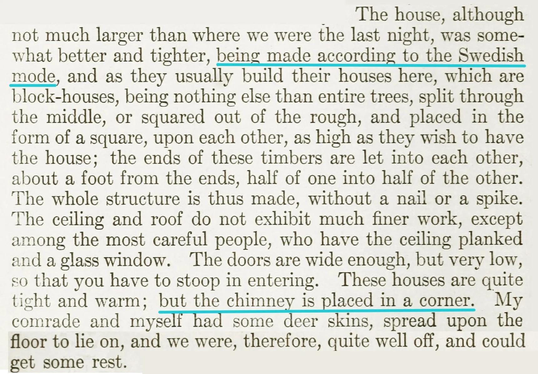 In 1749 Swedish explorer recorded the transition of the American landscape from a wilderness to a colonial society. His diaries include detailed descriptions of the vernacular architecture of Pennsylvania. In 1749 he described the log houses and corner fireplaces of New Sweden, above. Prototypes of corner fireplaces here in New Sweden include the hearths of Finnish savupirtti (smoke house).