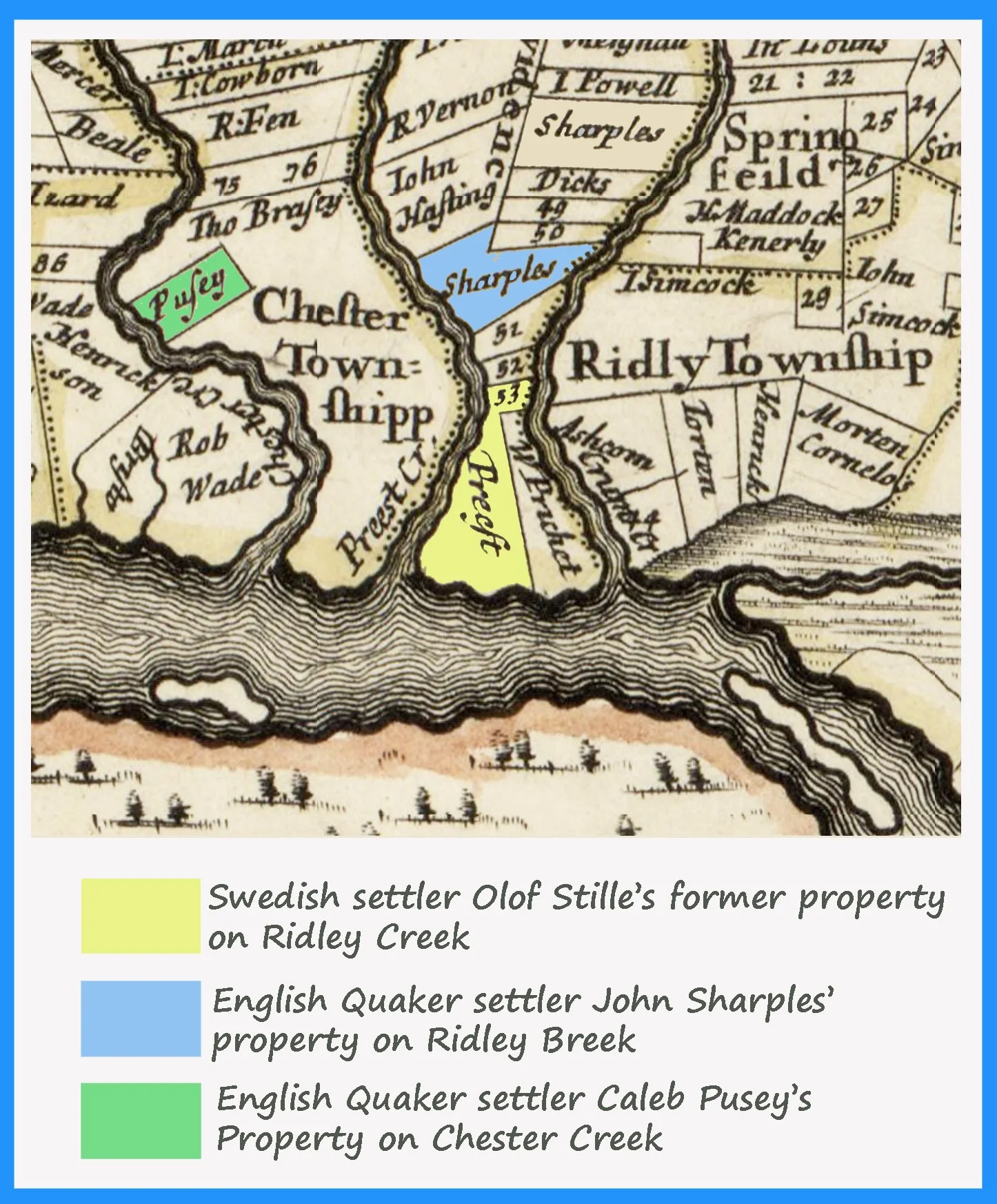 The map also identifies Olof Stille's former property on the Olof Stille’s Creek, by then known as Preest [Priest] Creek. The Stille property was owned by Pastor Lars Carlsson Lock. The creek later became Ridley Creek.