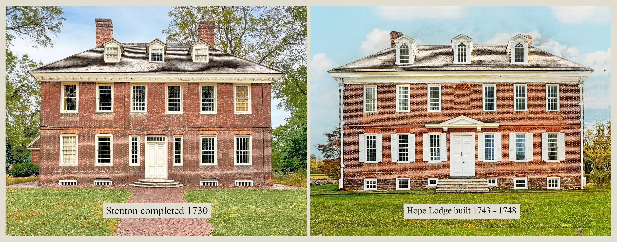 The front elevation of Logan’s Stenton is like a plain Quaker version of Daniel Campell’s Shawfield Mansion in Glasgow. Logan chose simple brick pilasters to add vertical elements to his house facade, while Daniel Campbell chose ornate stone quoins for his vertical accents.