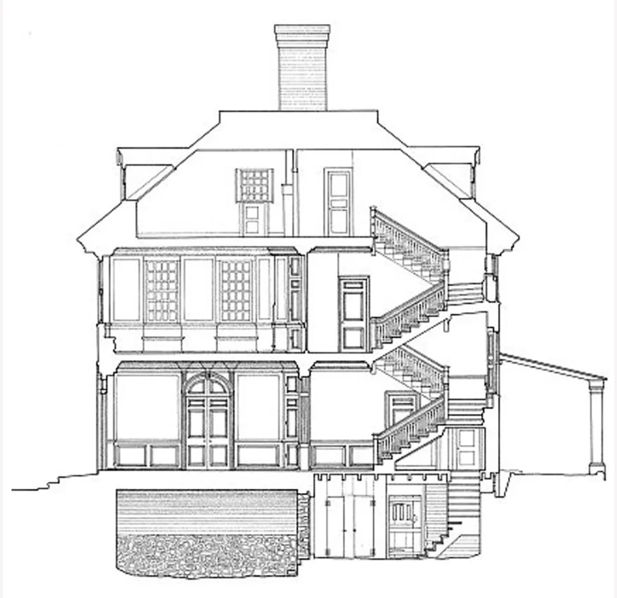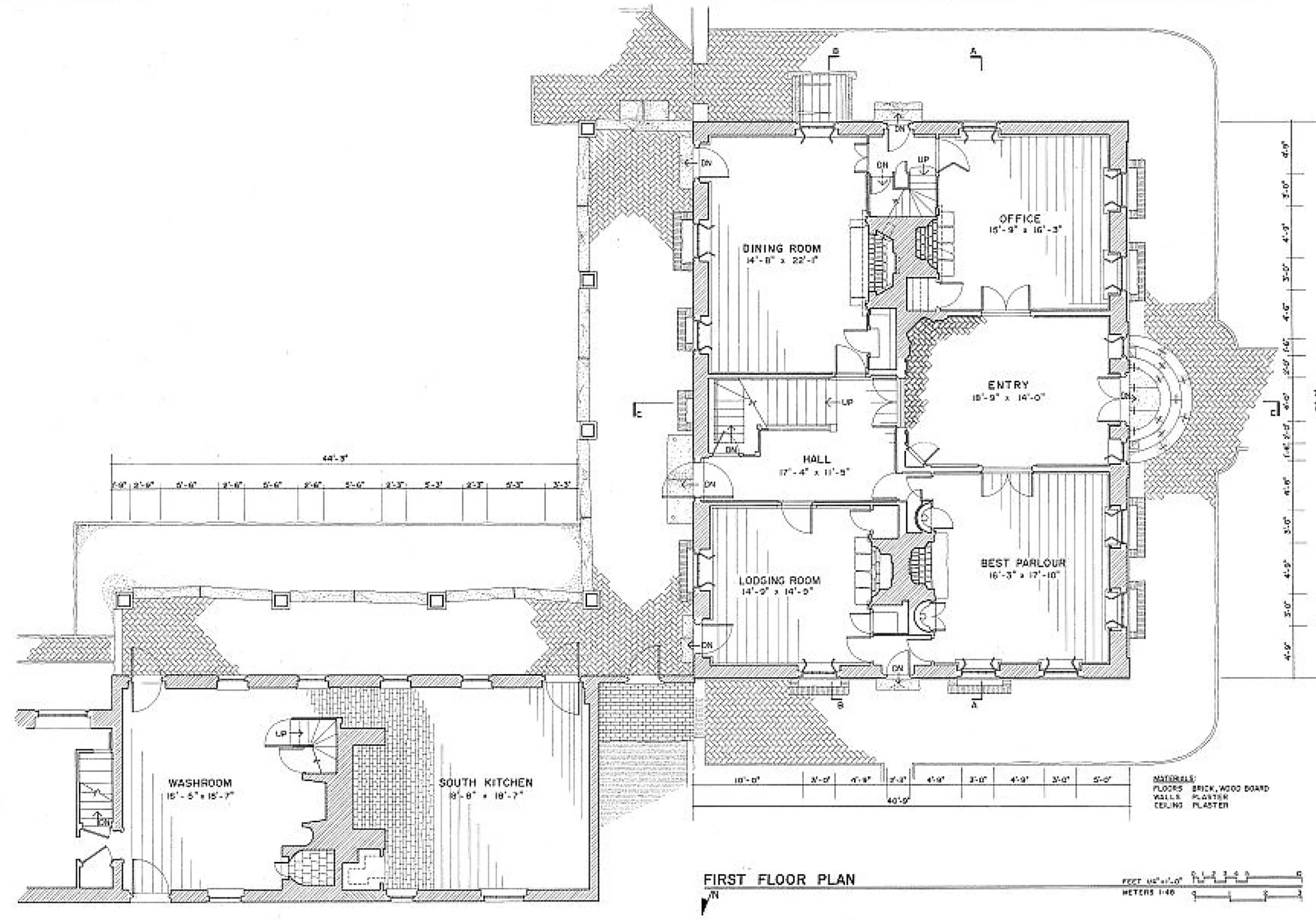Above: Stenton section, detail, drawn by Rebecca Trumbull Wiesenthal and Mary Ellen Strain, 1998. Image source: Historic American Buildings Survey