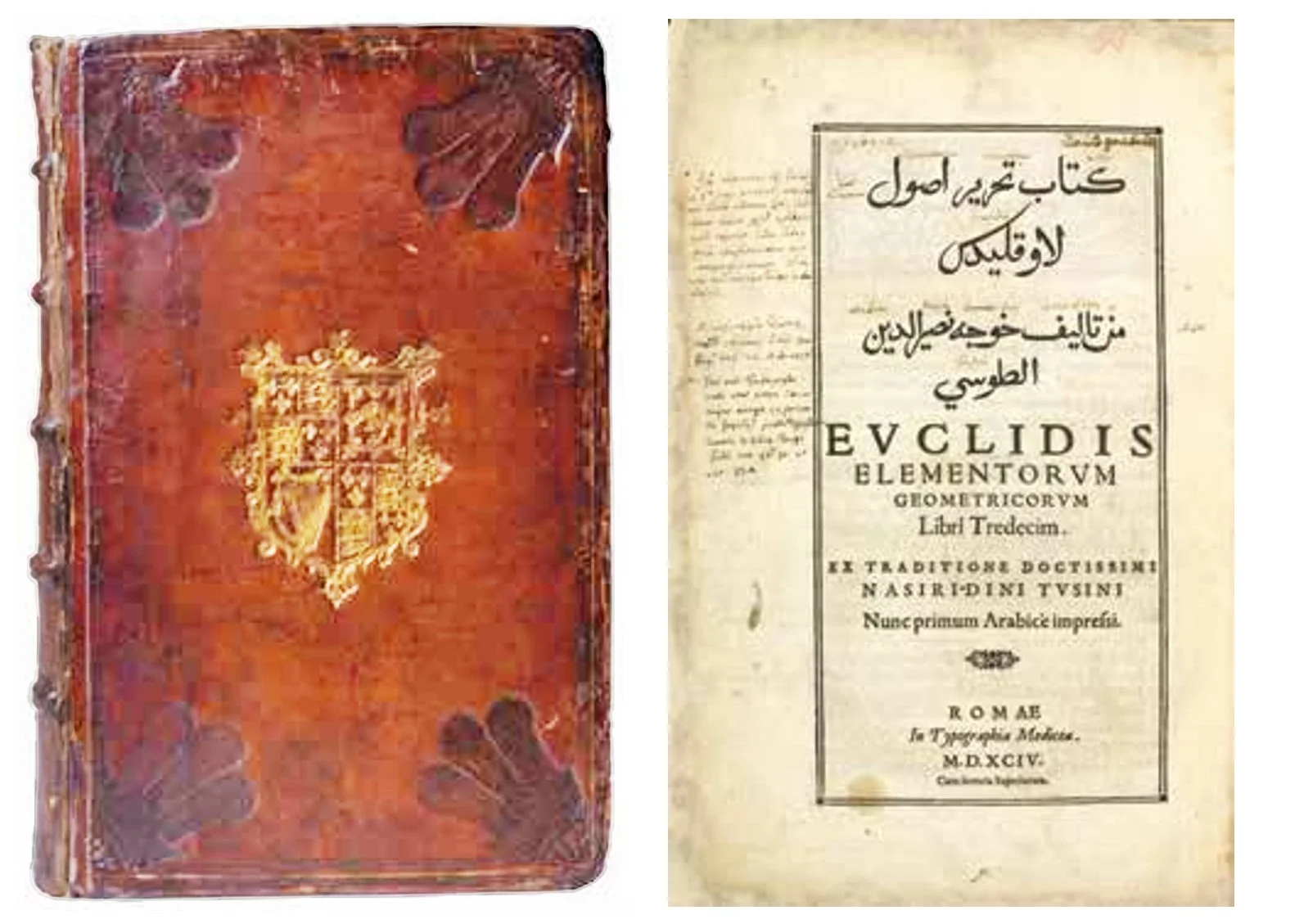 Logan’s books: Above left: Geoffrey Chaucer, Works. London, 1602, originally bound for Henry, Prince of Wales, with his arms and feather insignia. Right: Euclid in Arabic. Rome, 1594, with marginal notes in Arabic by James Logan. Image source: Library Company