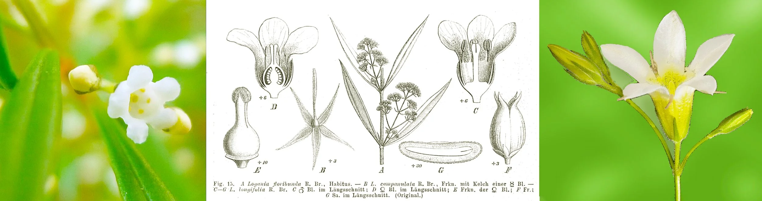 Above left Logania albiflora, Above center: Botanical illustration of three Logania species in Die natürlichen Pflanzenfamilien, Engler, 1892, Above right: Logania campanulata. Image source: Wikimedia: John Tann and Kevin Thiele.