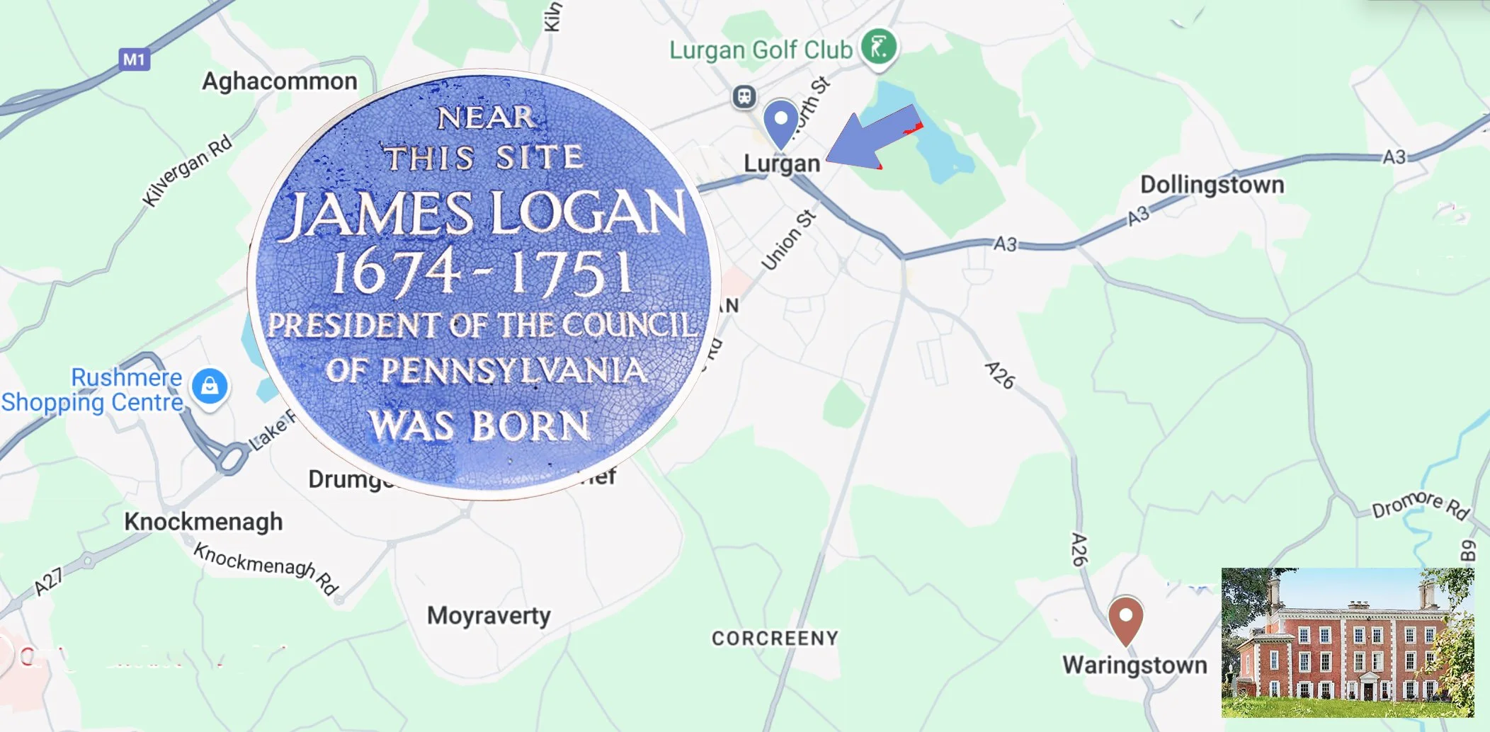 James Logan was born in Lurgan, County Armagh, Ireland, in 1674 to a Quaker family of Scottish descent. His father, Patrick Logan, was a schoolmaster and former Church of Scotland minister who converted to Quakerism. The Logans had left Scotland for Ireland seeking religious tolerance.