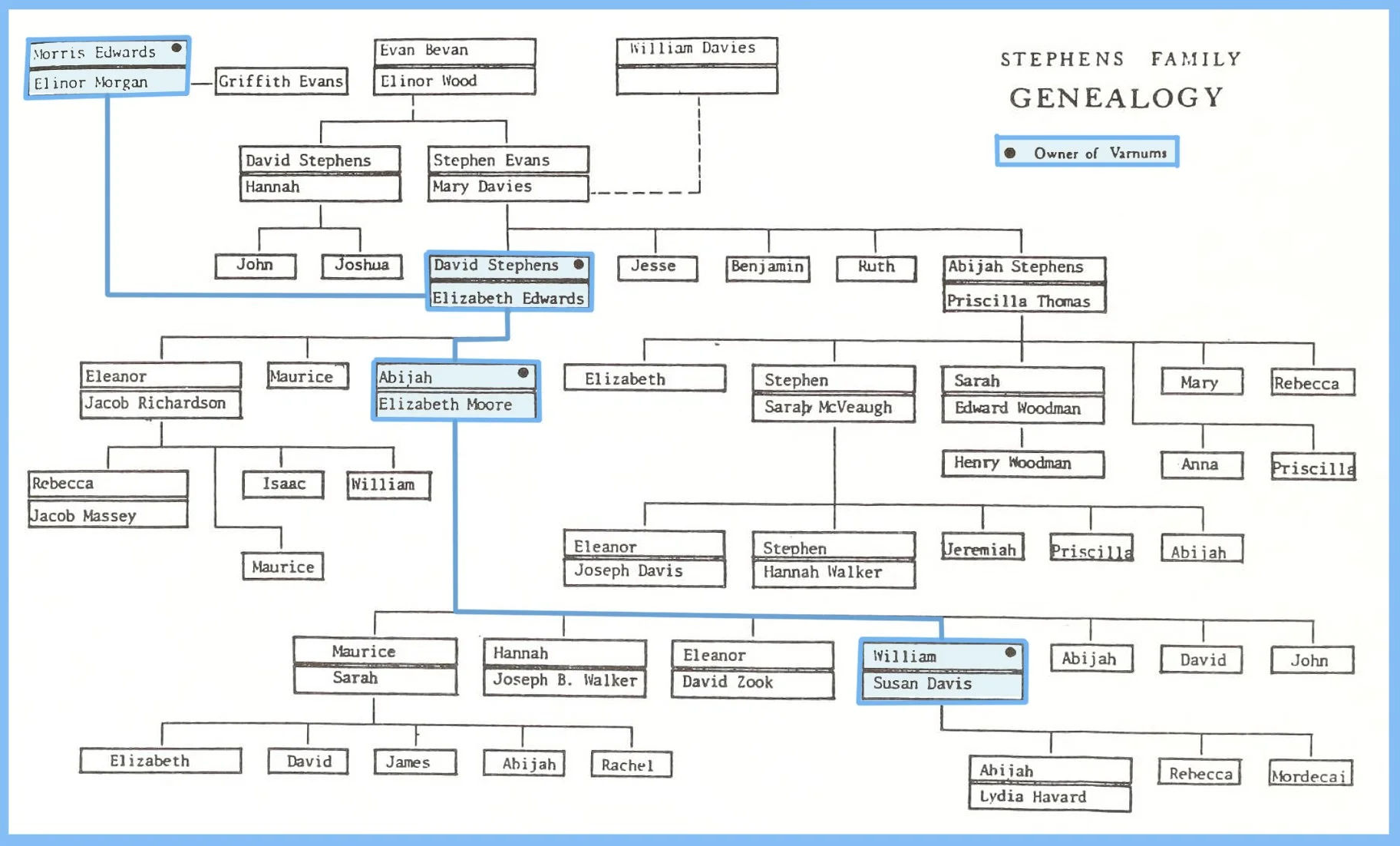 Above: Stephens genealogy researched by the National Heritage Corp, 1974. Image source: Historic Furnishings Report Varnum’s Quarters, John P. Brucksch, 1993. Internet Archive (color added)