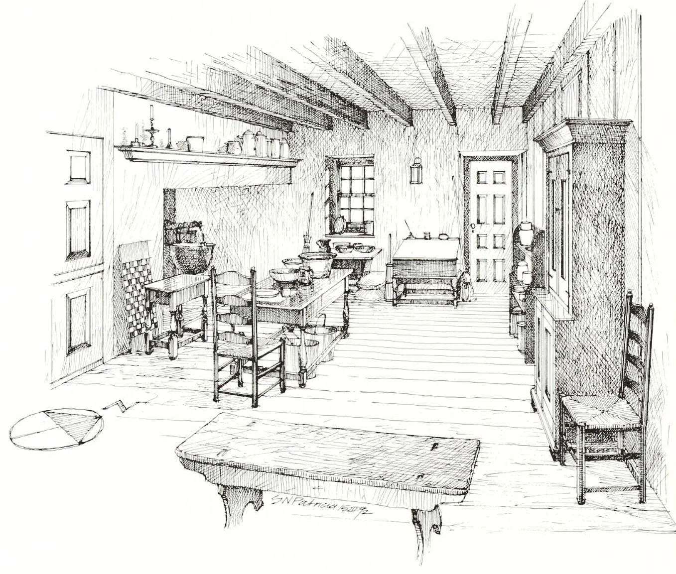 Kitchen Drawing by S. N. Patricia. Image source: Historic Furnishings Report Varnum’s Quarters, John P. Brucksch, 1993. Internet Archive