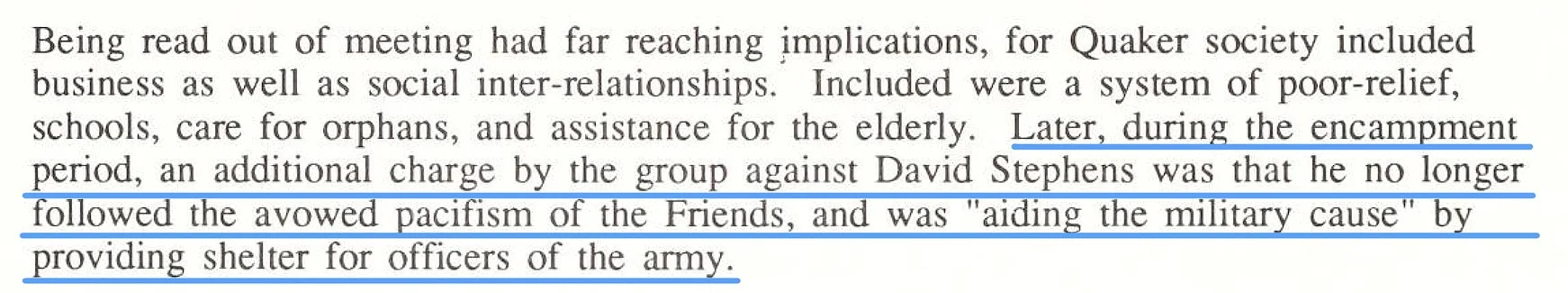 David Stephens had been read out of Radnor Monthly Meeting (disowned) by the Quakers in 1758. The reasons were his marriage to a Baptist woman and his intemperate habits in taverns.