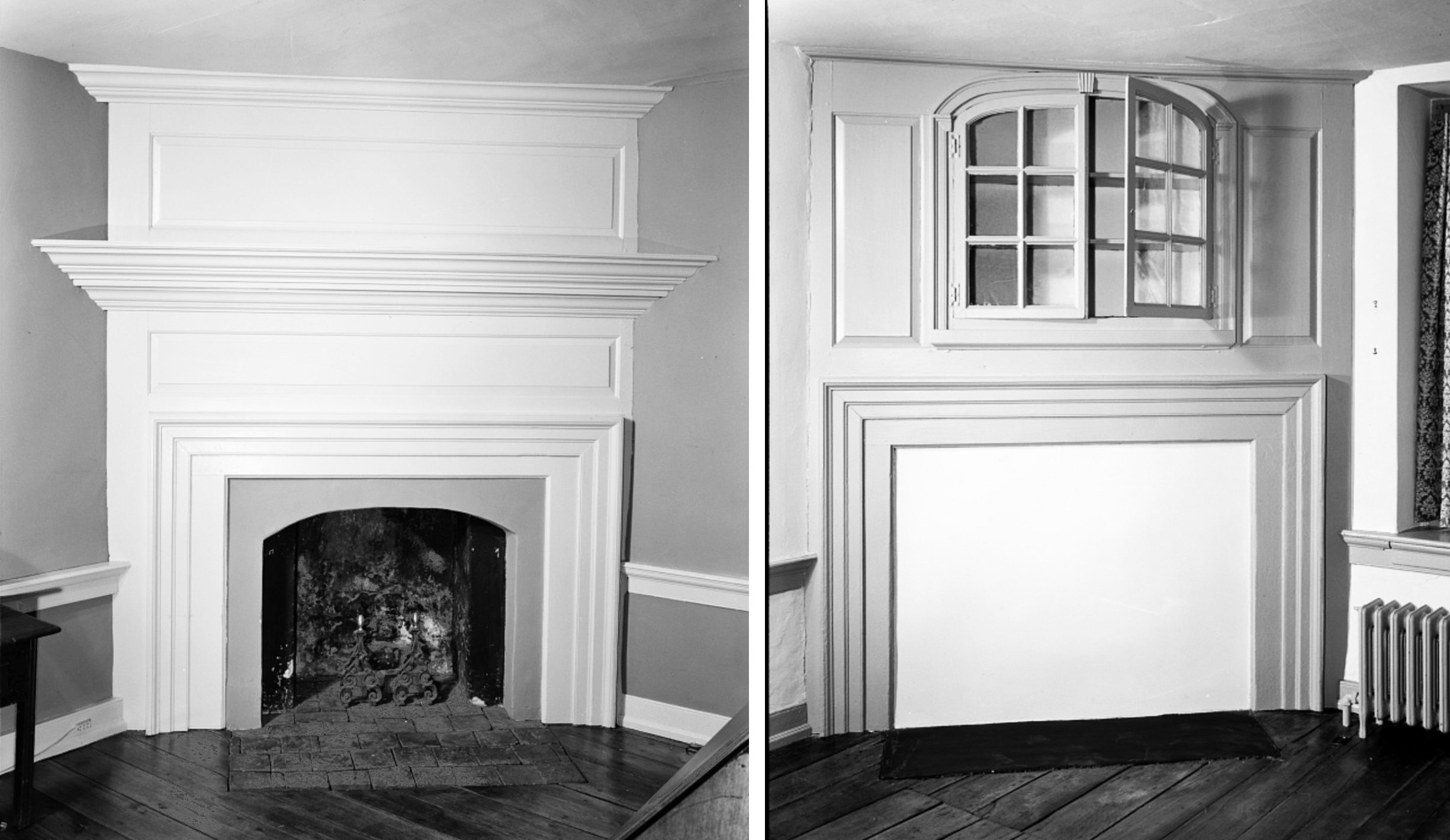Above: Two corner fireplaces on the first floor. Left: southwest room. Right: northwest room. Images source: Historic American Buildings Survey, Ned Goode, 1960.