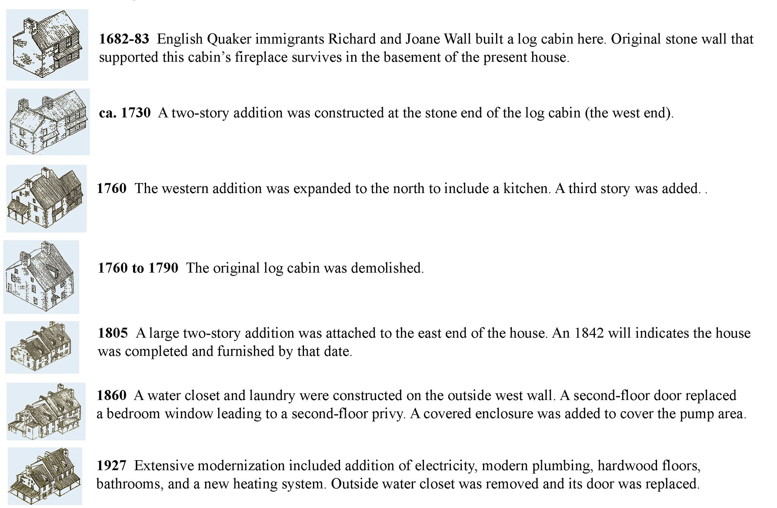 Richard Wall and Joane (Wheel) Wall emigrated to Pennsylvania in 1682 with Friends from Cheltenham, England. The next year, in 1683, they built a log house with a stone fireplace wall on the west side.