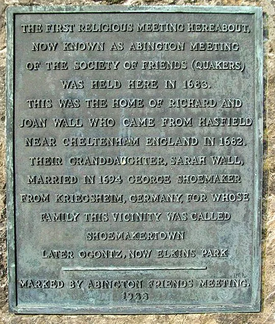 Text of historical maker, above: “The first religious meeting hereabout, now known as Abington Meeting of the Society of Friends (Quakers) was held here in 1683. This was the home of Richard and Joan Wall who came from Hasfield near Cheltenham England in 1682. Their granddaughter, Sarah Wall, married in 1694 George Shoemaker from Kriegsheim, Germany, for whose family this vicinity was called Shoemakertown, later Ogontz, now Elkins Park. Marked by Abington Friends Meeting 1933.”