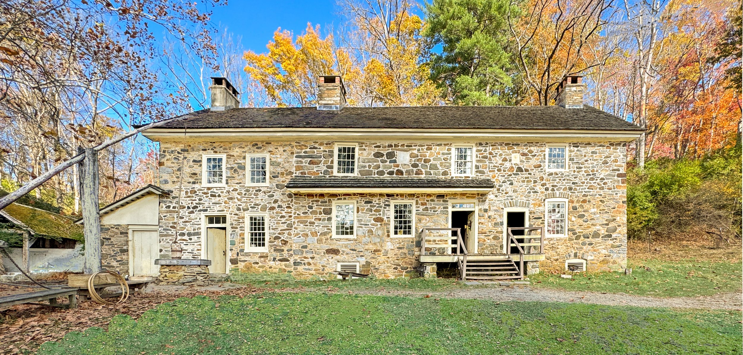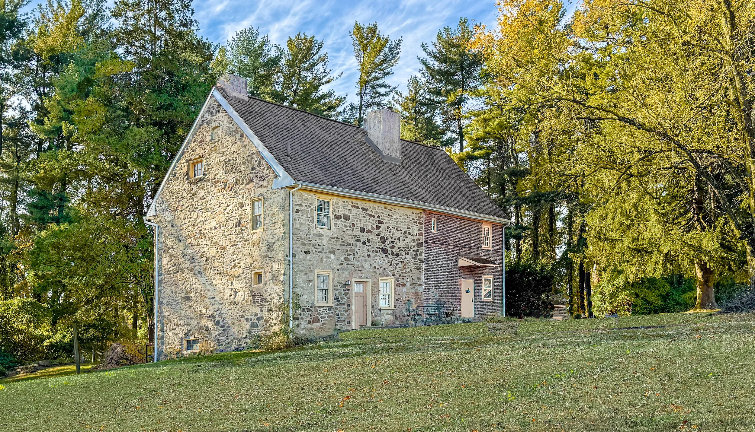 This house is the earliest structure in Ridley Creek State Park, and is among the earliest in Delaware County. English immigrant Henry Maddock apparently built the brick section between 1682 and 1690. Quaker immigrants John and Frances (Yardley) Worrall built the stone section in 1703. Image source: Lee J. Stoltzfus