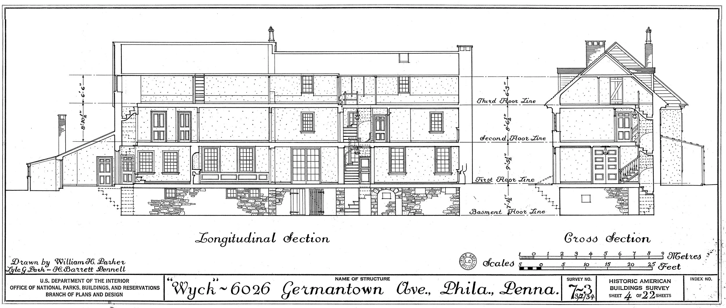 Above: Longitudinal section of Wyck drawn by William H. Parker, Lyle G. Park, and H. Barrett Pennell. Image source: HABS